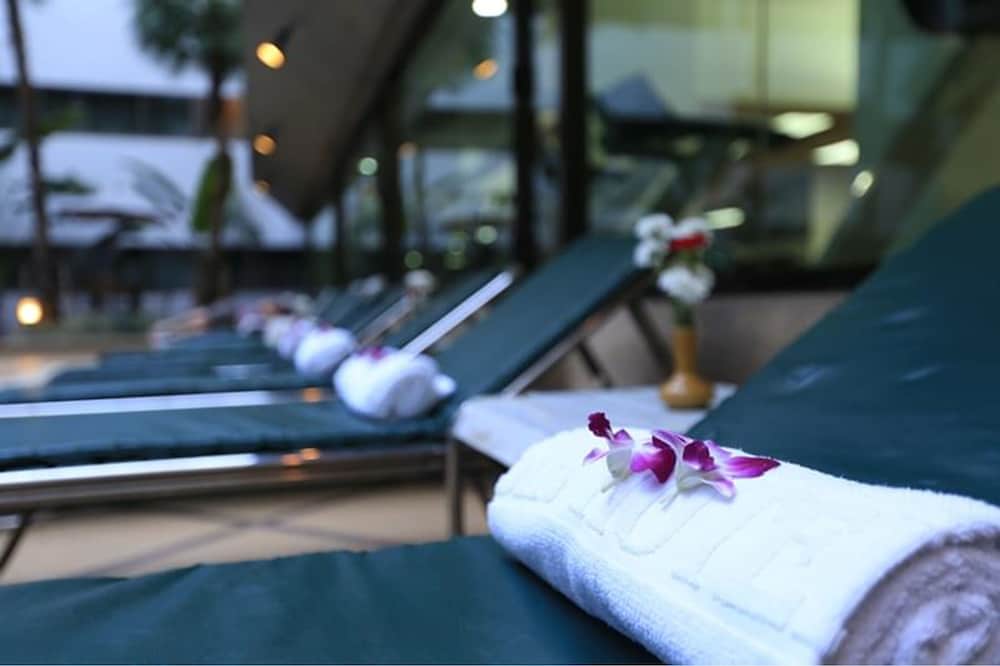 Superior Tourist Class Modern Hotel. (exterior) A 70s style concrete high-rise structure with a separate parking building. (lobby) It has a very large lobby with beautiful although dimly lit chandeliers. (general) The hotel has two swimming pools on the 5th and 12th floor, one in a tropical garden. Facilities also include a conference facility with capacity of a minimum 20 - 1500 pax, tennis court and fitness room. The hotel is located in the heart of the Thai local markets with easy access by Skytrain at Ratchatavee station.